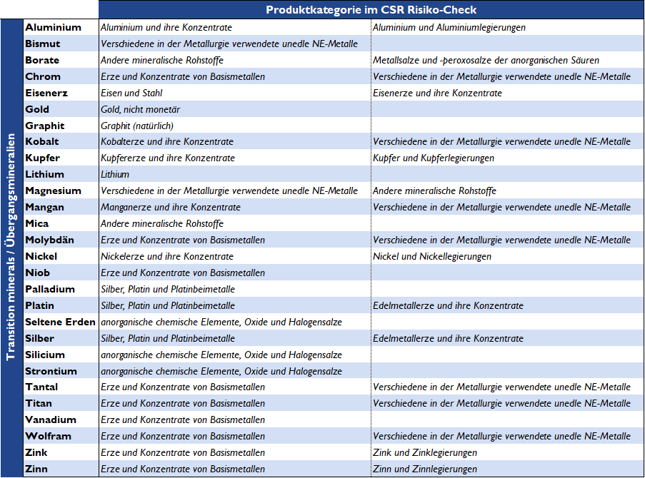 Um Unternehmen dabei zu unterstützen, diese Risiken zu identifizieren und anzugehen, empfehlen wir die Verwendung des CSR Risiko-Check zur Analyse der Lieferkette in Bezug auf diese Rohstoffe. Zur vereinfachten Nutzung wird innerhalb des CSR Risiko-Check die SITC-Klassifizierung angewendet. In der folgenden Tabelle (Tabelle 1) finden Sie die Suchbegriffe, mit denen Sie die relevanten Transition Minerals in unserem Tool finden können.